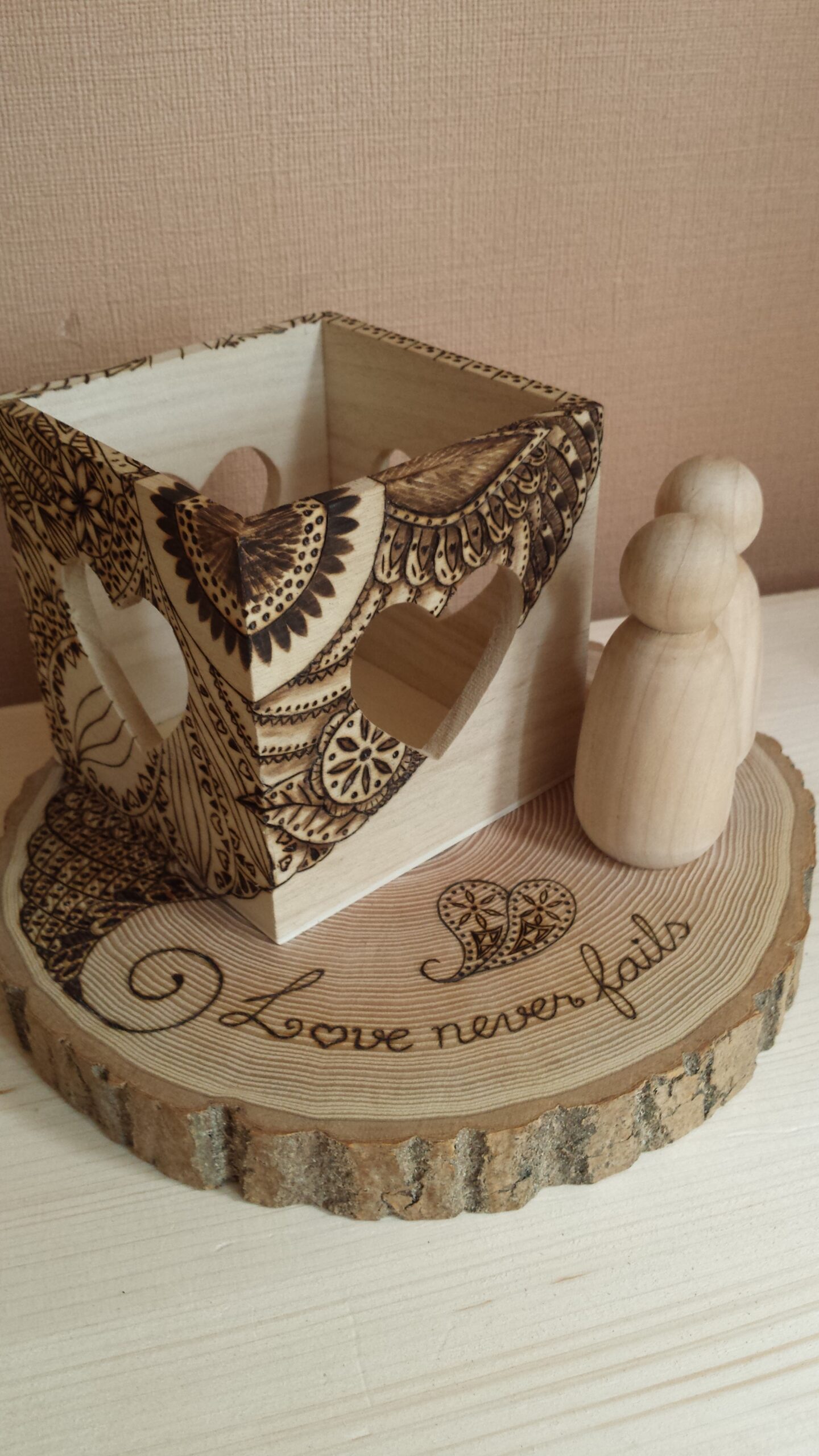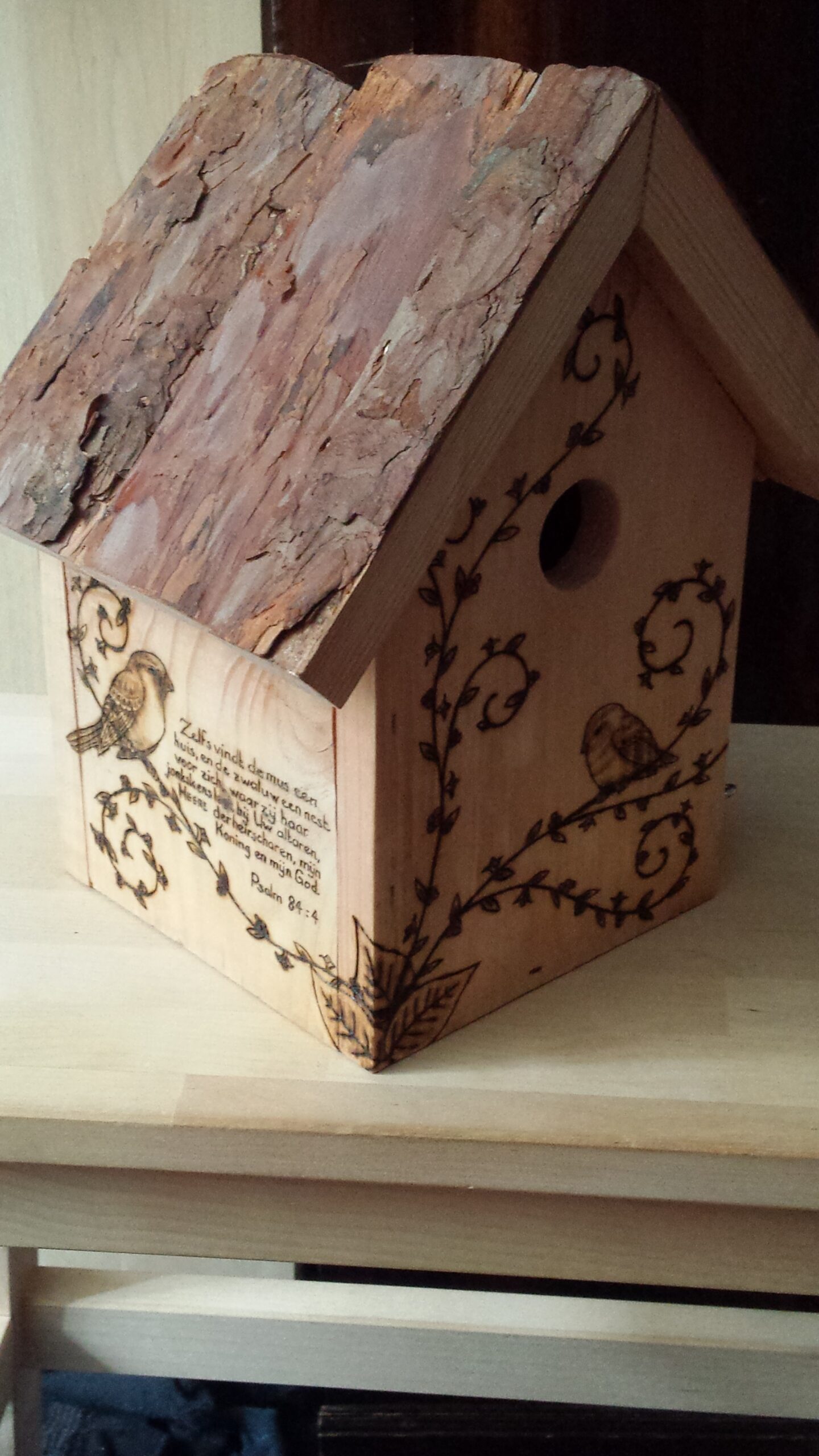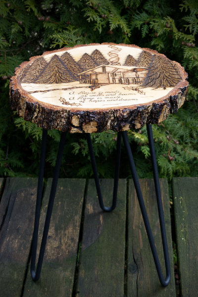 Dit koffietafeltje heb ik gemaakt voor mijn inschrijving op het Hout- en Meubileringscollege. Het ontwerp heb ik op papier getekend en op de boomstamschijf overgetrokken met carbonpapier. Dit heb ik met een pyrografie-apparaat in het hout gebrand waarna ik het heb afgewerkt met lak en de poten eronder heb gemonteerd.